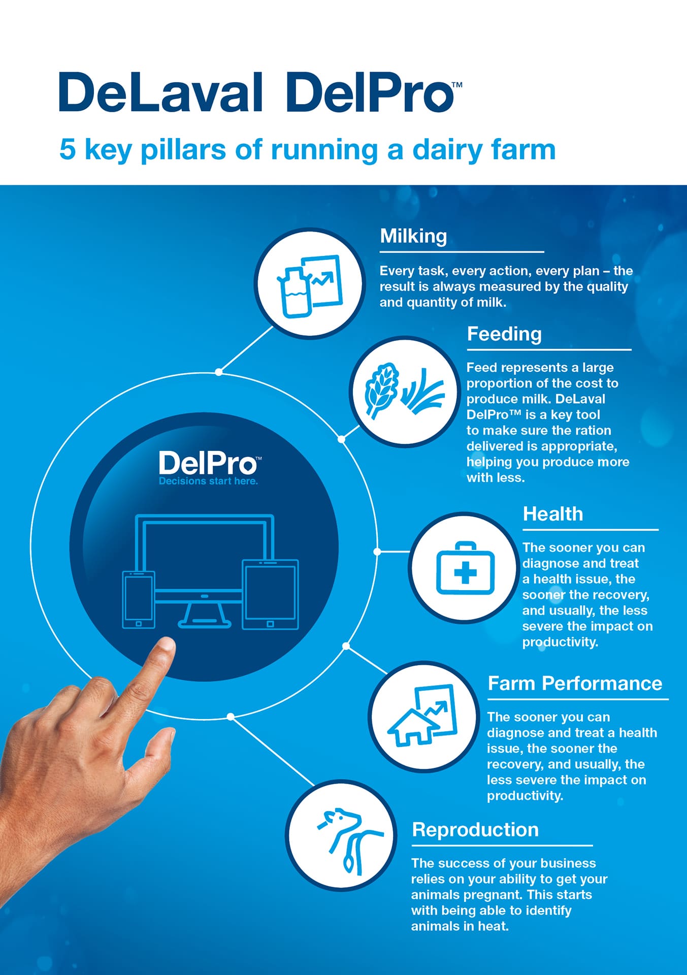 On a dairy farm everything is inter-related and every decision has multiple impacts. That’s why DeLaval DelPro™ has been designed to support the 5 key pillars of farm management, and to provide you tools to help you make the decisions that will maximise your results for your whole farm. When you need to make a decision on your dairy farm, the first place to turn for trusted, useful information is DelPro. It’s where better decisions start.